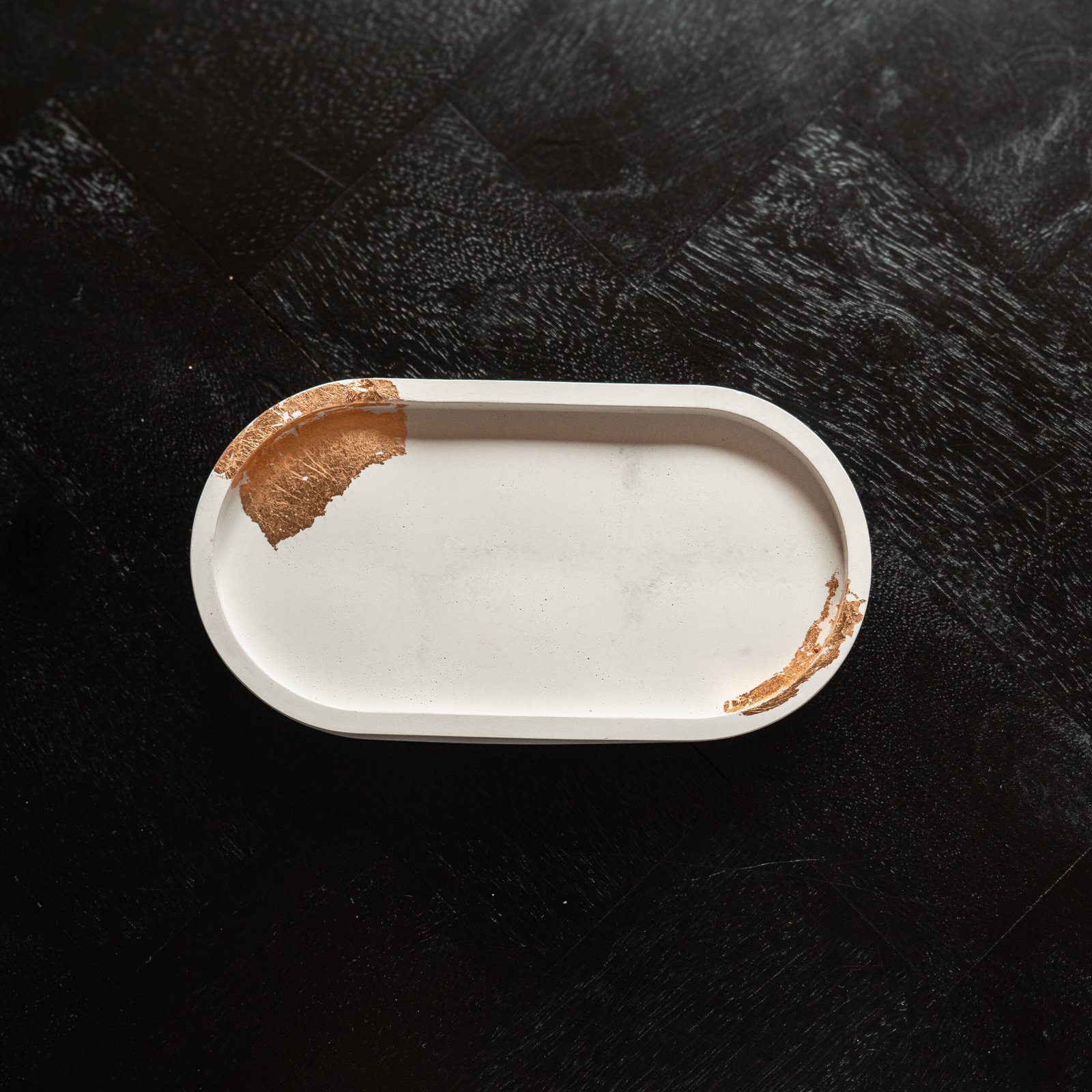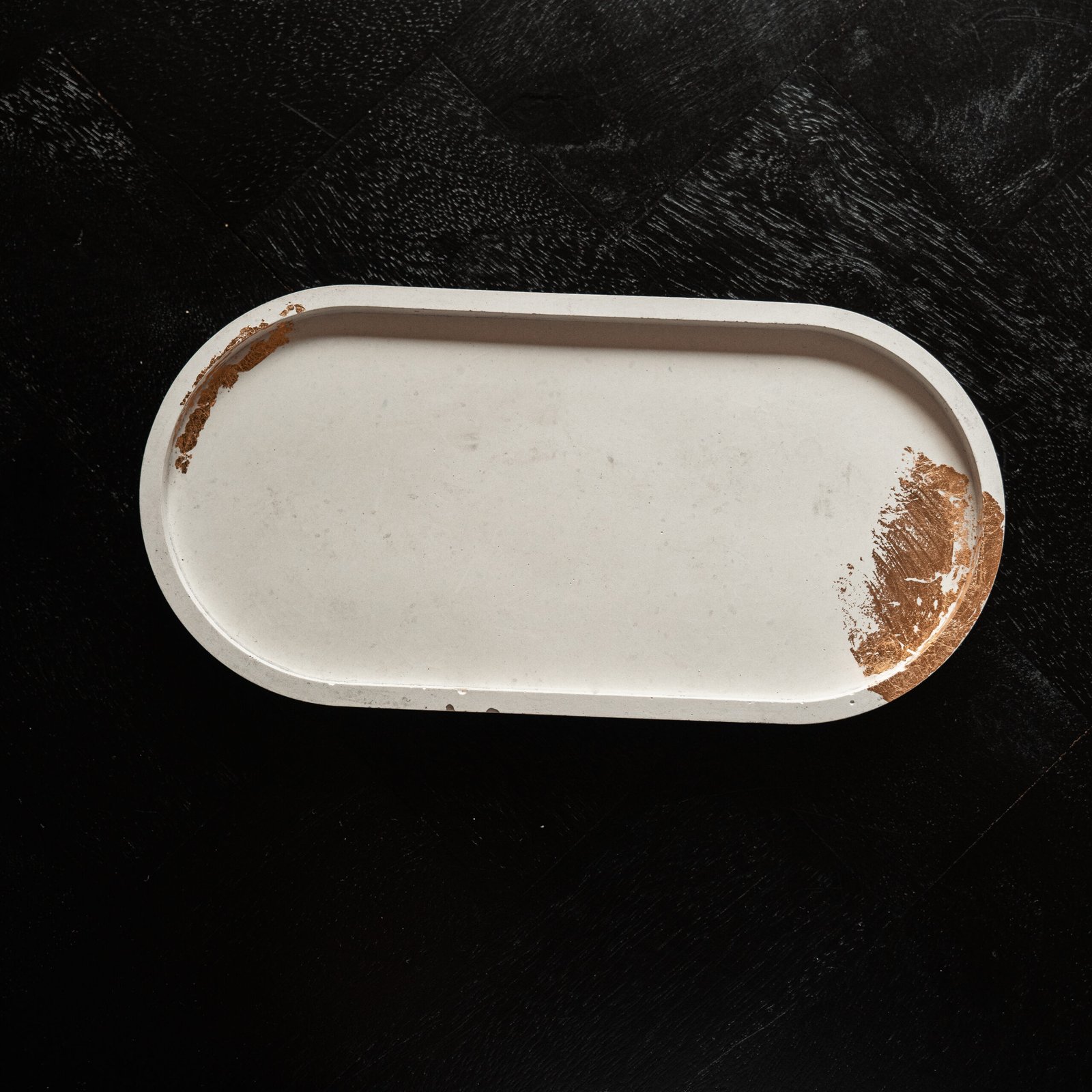 Deze minimalistische witte betonnen tray is met de hand gegoten en afgewerkt met subtiele bladgouden accenten voor een luxueuze uitstraling. Elke schaal is uniek, met natuurlijke imperfecties die het ambacht weerspiegelen.
